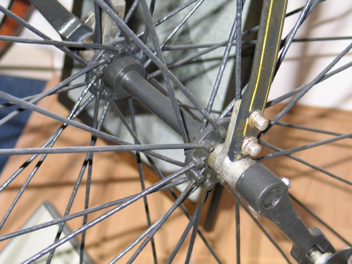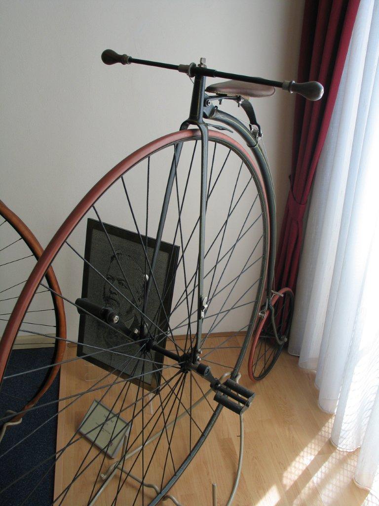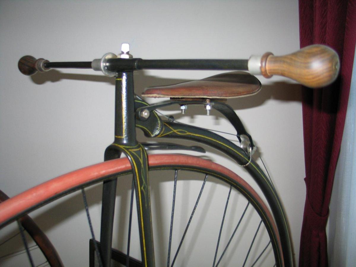 This ordinary bicycle was called The Tangent, and it was the first bicycle that featured tangent pattern spokes. It was introduced in 1876 or 1877 and built by Haynes & Jefferis from Coventry. It is a rare bird, especially in this very good condition. Look at the Ariel from those years, also built by Haynes and Jefferis. Some details are the same, like the ‘roller’ at the end of the spring.